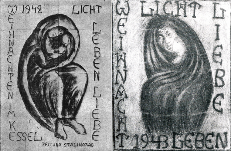 Das erste entstand im Kessel von Stalingrad. Am Heiligen Abend 1942 bereitet Reuber dort seinen Kameraden eine eindrucksvolle Freude. Als die Männer den schützenden Bunker zur einsamen Weihnachtsfeier betreten, stehen sie gebannt, andächtig und ergriffen vor dem Bild einer Mutter mit Kind (Bild links). In sanften Linien umgibt der Mantel die beiden Gestalten. Mit menschlich kaum nachvollziehbarer Kühnheit setzt der Künstler dem Kessel von Stalingrad, dem Inbegriff von Dunkelheit, Tod und Hass, eine zarte Szene entgegen: Der Mantel ist wie ein bergender, schützender Kreis, und die Gesichter von Maria und dem Neugeborenen erscheinen den Betrachtenden in inniger Zuneigung. Hier sammelt sich der Blick. Daneben die Lettern „Licht, Leben, Liebe“. – Das Bild wurde später unter dem Namen „Madonna von Stalingrad“ bekannt und zu einem Symbol der Versöhnung.