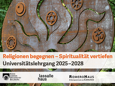 Im März 2025 startet der Universitätslehrgang «Spirituelle Theologie im interreligiösen Prozess“ in Kooperation mit dem Lassalle-Haus Bad Schönbrunn. Als Lehrgang mit der Möglichkeit, einen Master zu erwerben, spricht er Gestalter in Bildung oder Politik, Wirtschaft und Gemeinwesen an: Er vermittelt Kompetenz, Wissen und Werkzeuge, um diese Dialoge in allen Gesellschaftsbereichen zu initiieren und zu moderieren.